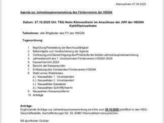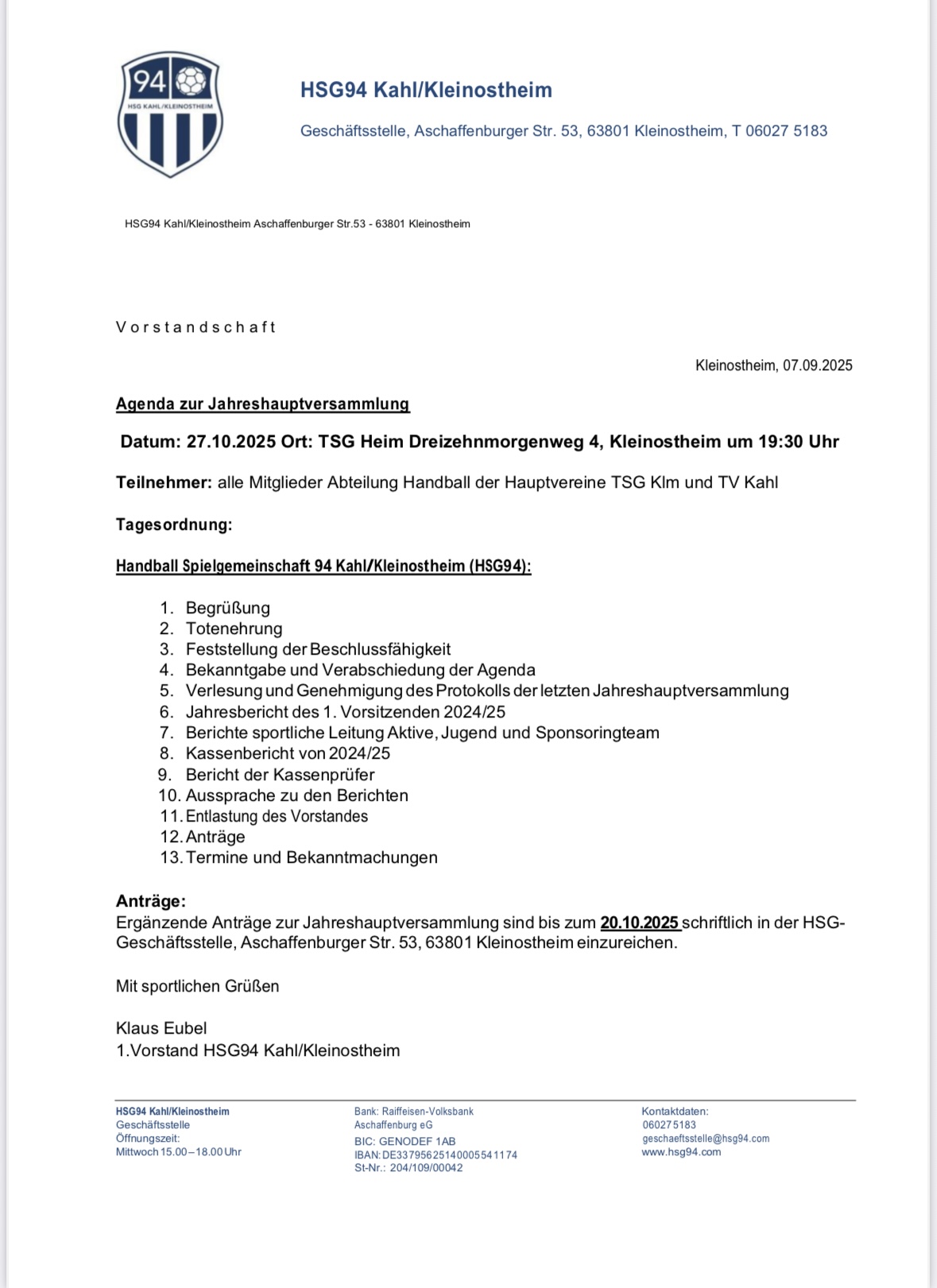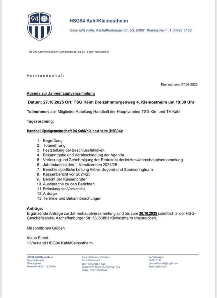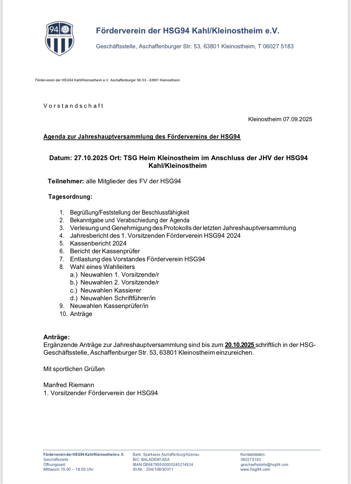 Featured in Allgemein, NEWS Am 27.10. finden ab 19:30 Uhr im TSG-Heim Kleinostheim die Jahreshauptversammlungen der HSG 94 und des Fördervereins statt 🔵⚪️ Herzliche Einladung dazu 🙌🏻 Nachfolgend die Agenden ⬇️ Previous Post Herren 1: 94er verlieren enge Partie in der Schlussphase 😕 AKTIVE HERREN I Berichte Spielberichte 30. September 2025 Attachment