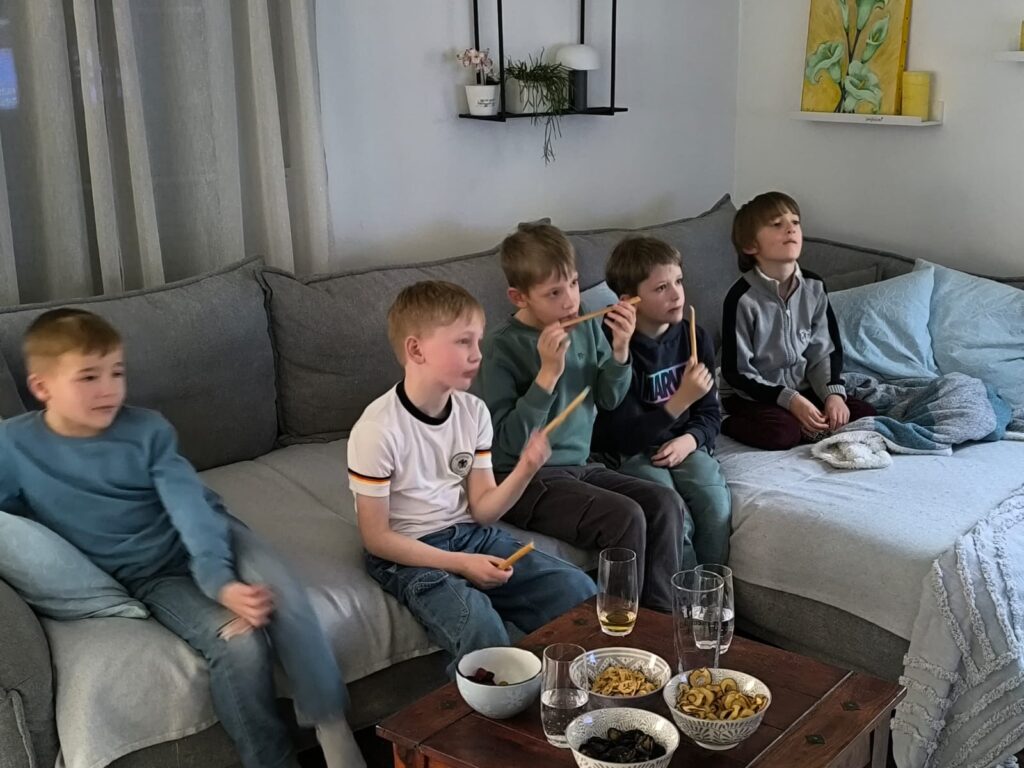 Trotz der kurzfristigen Bekanntgabe der Anpfiffzeit konnten es sich knapp ein Drittel der Spieler ermöglichen, das Spiel gemeinsam zu schauen. Bei Chips und GummibÀrchen wurde zusammen das erste Spiel der Hauptrunde verfolgt.