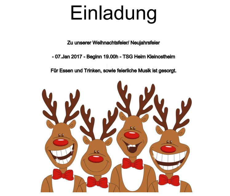 Am 07.01.2017 steigt unsere traditionell im Januar liegende “Weihnachtsfeier“. Dieser Abend soll wie ein gemütliches Zusammenkommen zum Jahresabschluss ermöglichen. Für Essen und Trinken ist reichlich gesorgt. Beginn ist um 19:00 Uhr im TSG