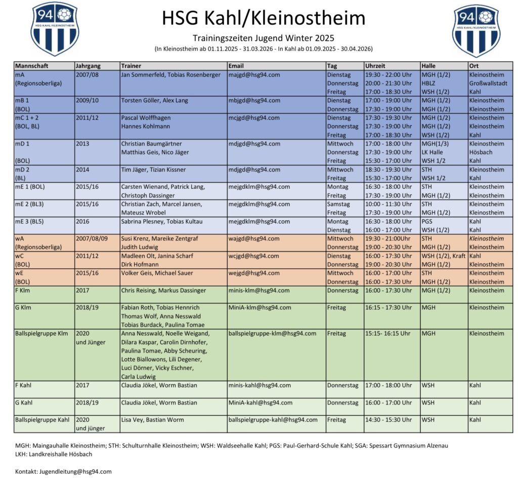 Featured in AKTIVE, Allgemein, JUGEND, NEWS Ab 01.11.2025 bis 31.03.2026 in Kleinostheim und ab 01.09.2025 bis 30.04.2026 in Kahl sind die Trainingszeiten der HSG94 wie folgt Screenshot tags: 94er Auflagen corona Handball Hygiene jugend Kahl Kleinostheim Training Previous Post mA: Heimniederlage im Nachbarschaftsduell A-Jugend MÄNNL. A-Jugend Spielberichte 23. Oktober 2025