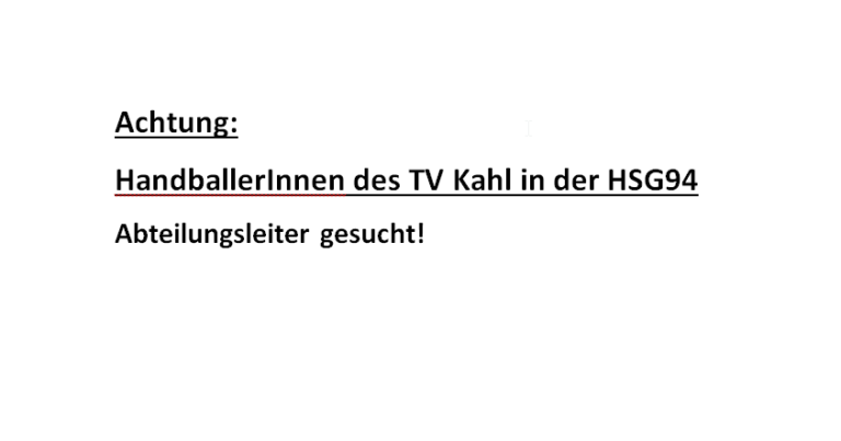 Achtung HandballerInnen des TV Kahl in der HSG 94 Abteilungsleiter gesucht! Nach über 10 Jahren im Dienst des Kahler Handballs hat Markus Jökel im letzten Jahr den Handball -Abteilungsleiterjob aufgegeben. Er wird weiter, wie bisher auch, mit Engageme